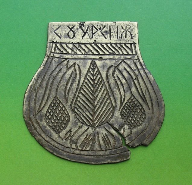 На першому фото бачимо щиток – пластину, на якій вирізьблено текст у вигляді двох велесовичних абревіатур, які звучать так – СВРГІЄОЦЬ і СОУРЄНЖ. Справа і зліва від текстів відтворені сварги, а під текстом подано рівнораменний хрест з округлими заглибленнями на кінцях.