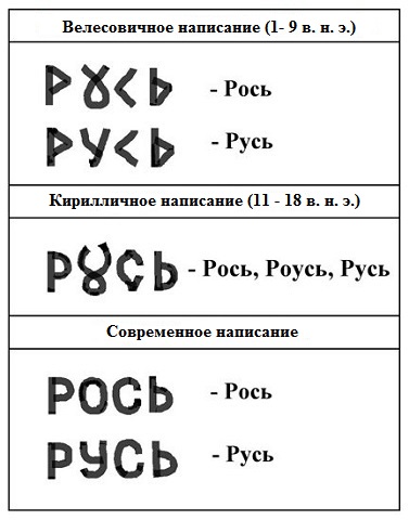 Так велесовичне слово РОСЬ у кириличному прочитанні могло звучати у трьох варіантах: як РОСЬ, РОУСЬ чи РУСЬ, що кардинально спотворювало закладену у слові сакральну інформацію.
