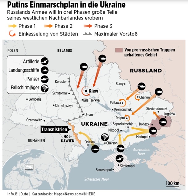 На первом этапе будет захвачен юг Украины, "чтобы обеспечить поставки в Крым, а также отрезать Украину от моря и, следовательно, от снабжения", - сказал BILD офицер службы безопасности.