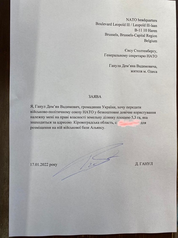 Одессит заявил, что направил в НАТО письмо, в котором предложил предоставить в бесплатное пожизненное пользование свою землю в Кировоградской области.